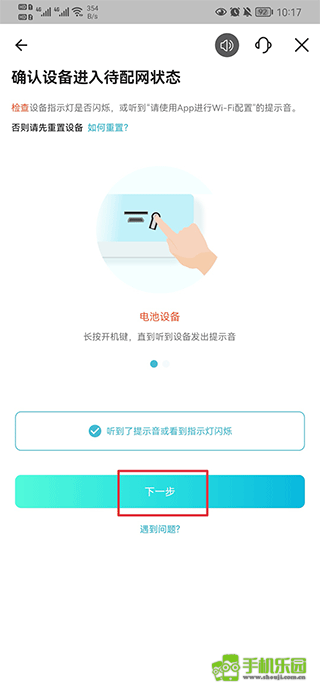三、按照提示将设备插电开机并在听到提示音后,点击下一步
