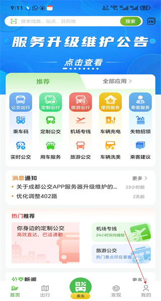打开软件进入首页后,页面会呈现公交出行、定制出行等功能选项,此时点击右下角的“我的”,即可进入个人功能页面。