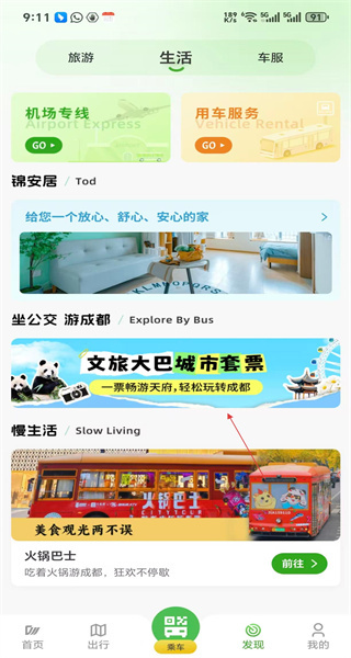 4、登录后进入发现页面,能看到文旅大巴城市套票之类的生活服务内容,点击对应的板块,就可以开始探索特色公交服务了。
