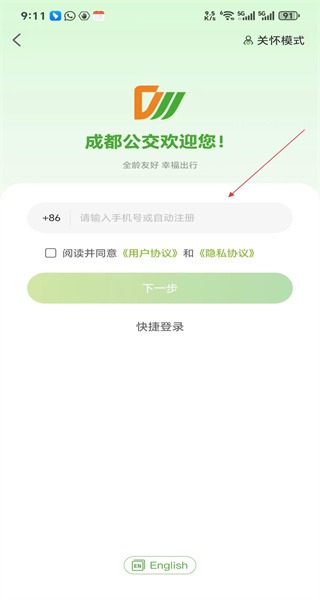 3、进入登录界面后,输入手机号码,勾选用户协议,为完成登录操作做好准备。