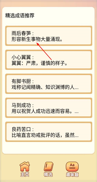 1、启动软件后,进入精选页面,能看到“雨后春笋”等推荐成语,点击“雨后春笋”,即可进入该成语的详情弹窗页面。