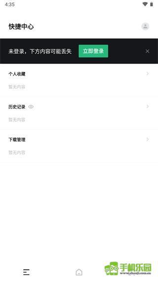 2、页面底部设有导航栏,除主页外,还包含左侧的快捷中心与右侧的多窗口功能。在快捷中心里,用户能查看个人收藏、历史记录及相关内容,App也会在此处提示用户登录。点击多窗口后,用户可看到当前已打开的页面,并能对页面执行添加或删除操作。此外,该页面右下角还设有无痕浏览的快捷入口,方便用户访问隐私内容。