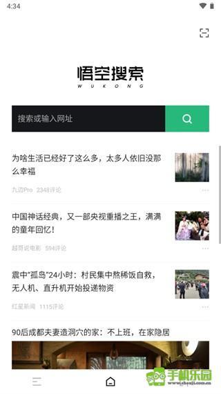 1、主页中间设有黑绿撞色的搜索栏,其上方是悟空搜索的中英文标识,下方则是推荐的信息流内容,右上角还提供二维码扫码功能。当用户开始浏览信息流时,标识会逐渐淡出,搜索栏也会相应简化,以此优化用户的阅读体验。