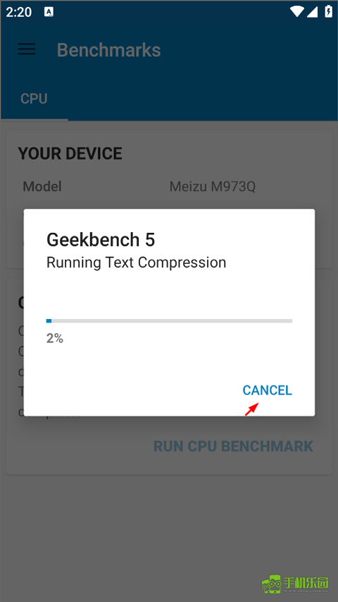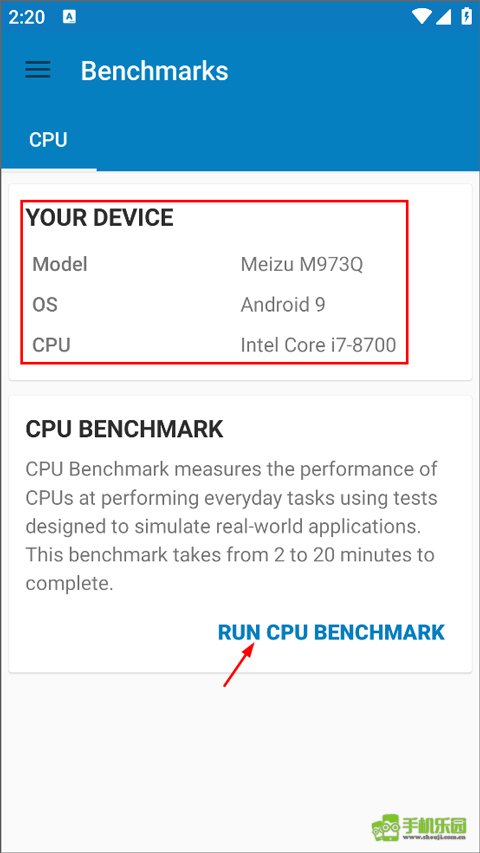 1、用户从本站并安装启动应用,进入首页后,就能看到自己的手机品牌、CPU等信息,点击“RUN CPU BENCHMARK”按钮开始性能测试。