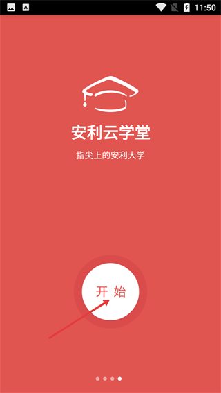 1、在【安利云学堂】引导页点击【开始】按钮,就能进入应用的登录环节,该平台被定位成“指尖上的安利大学”,主要提供学习相关服务。