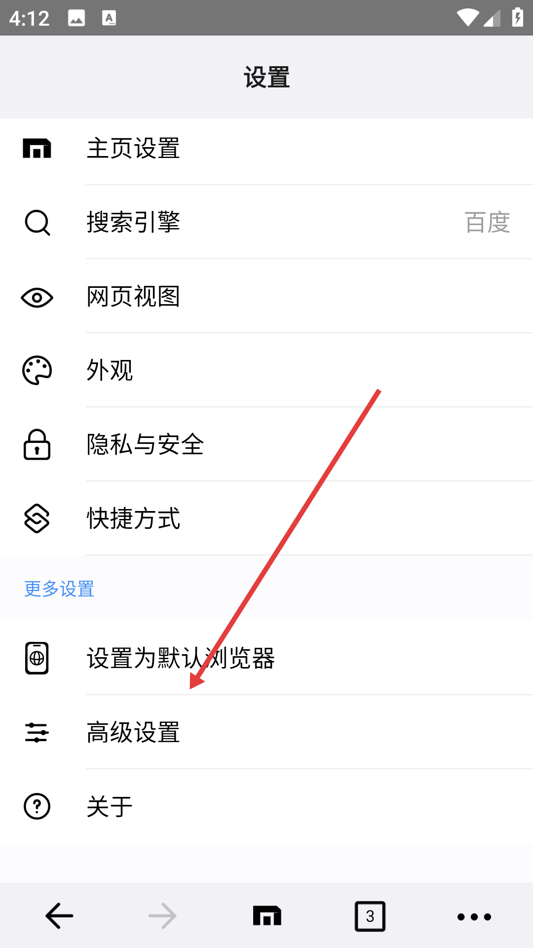 2、在设置页面中找到并点击【高级设置】选项,即可进入高级设置页面。