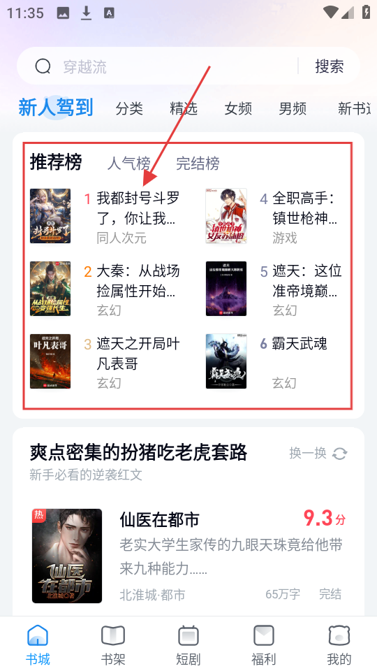 1、我们进入软件,能看到推荐榜、人气榜等榜单,若想找热门小说,选推荐榜里的作品吧。