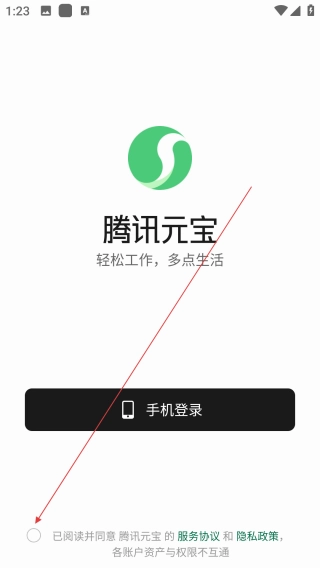 1、打开腾讯元宝,点击【同意协议】。