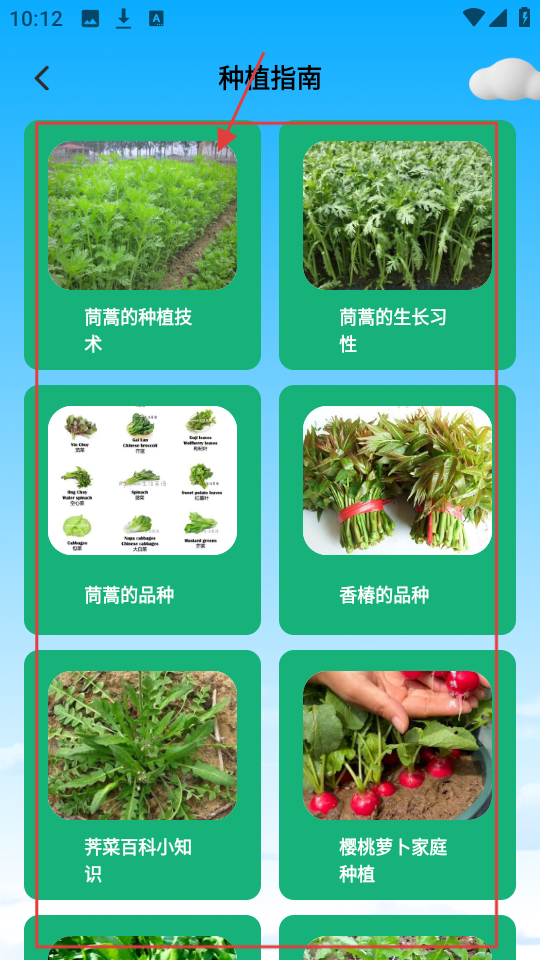 2、在种植指南页面中,包含了多种与植物种植相关的内容,你可以挑选自己感兴趣的植物,比如茼蒿,然后进入该植物的详情页面。