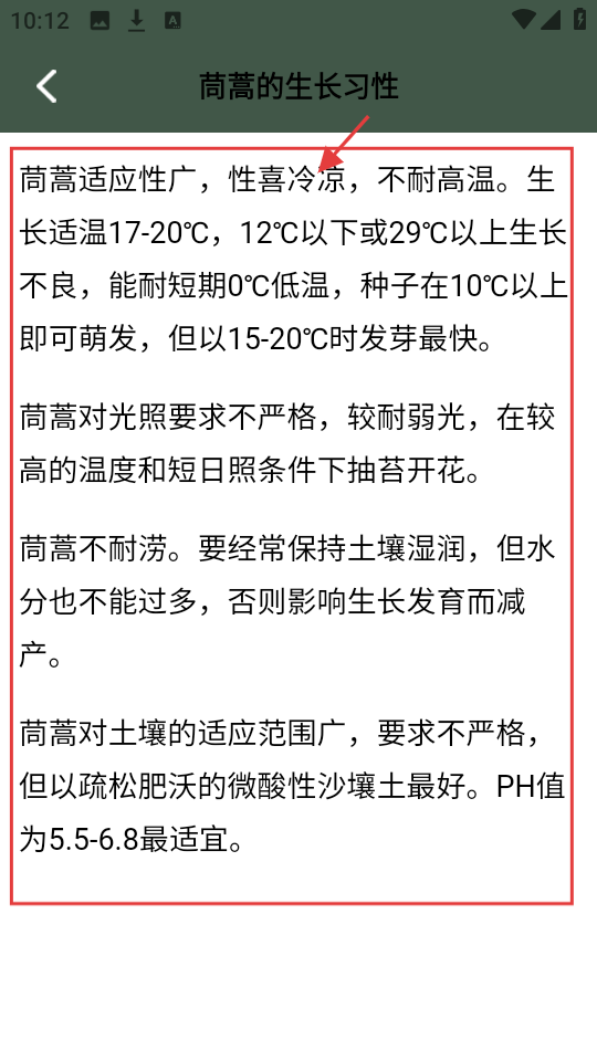 3、进入茼蒿生长习性的详情页面,了解茼蒿在温度、光照等方面的需求,从而掌握种植它的关键要点。