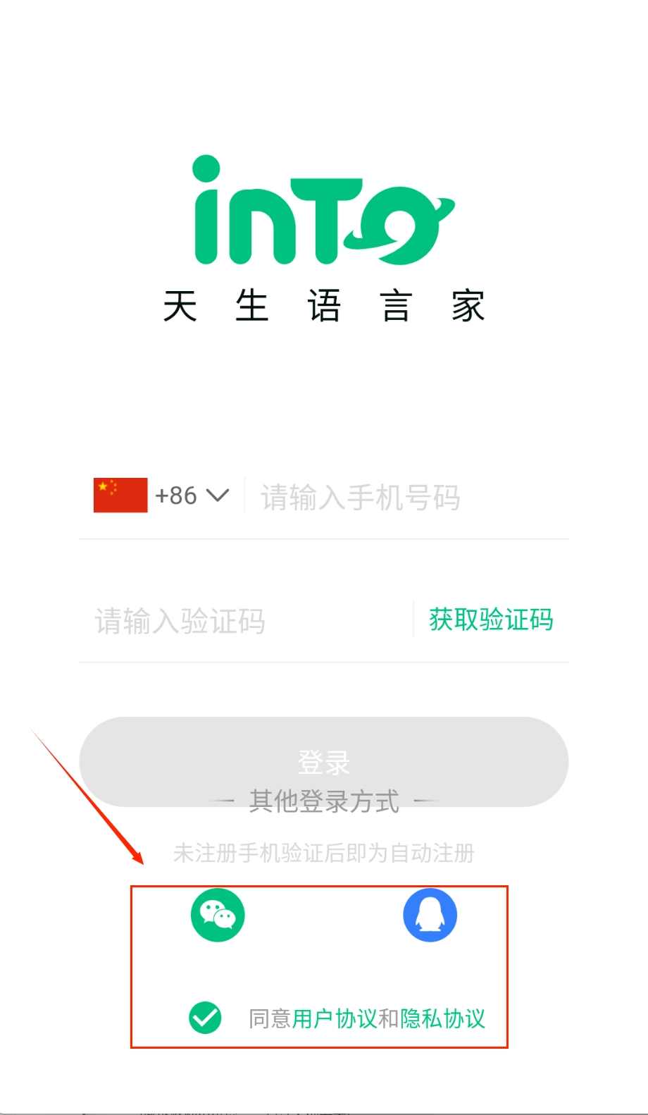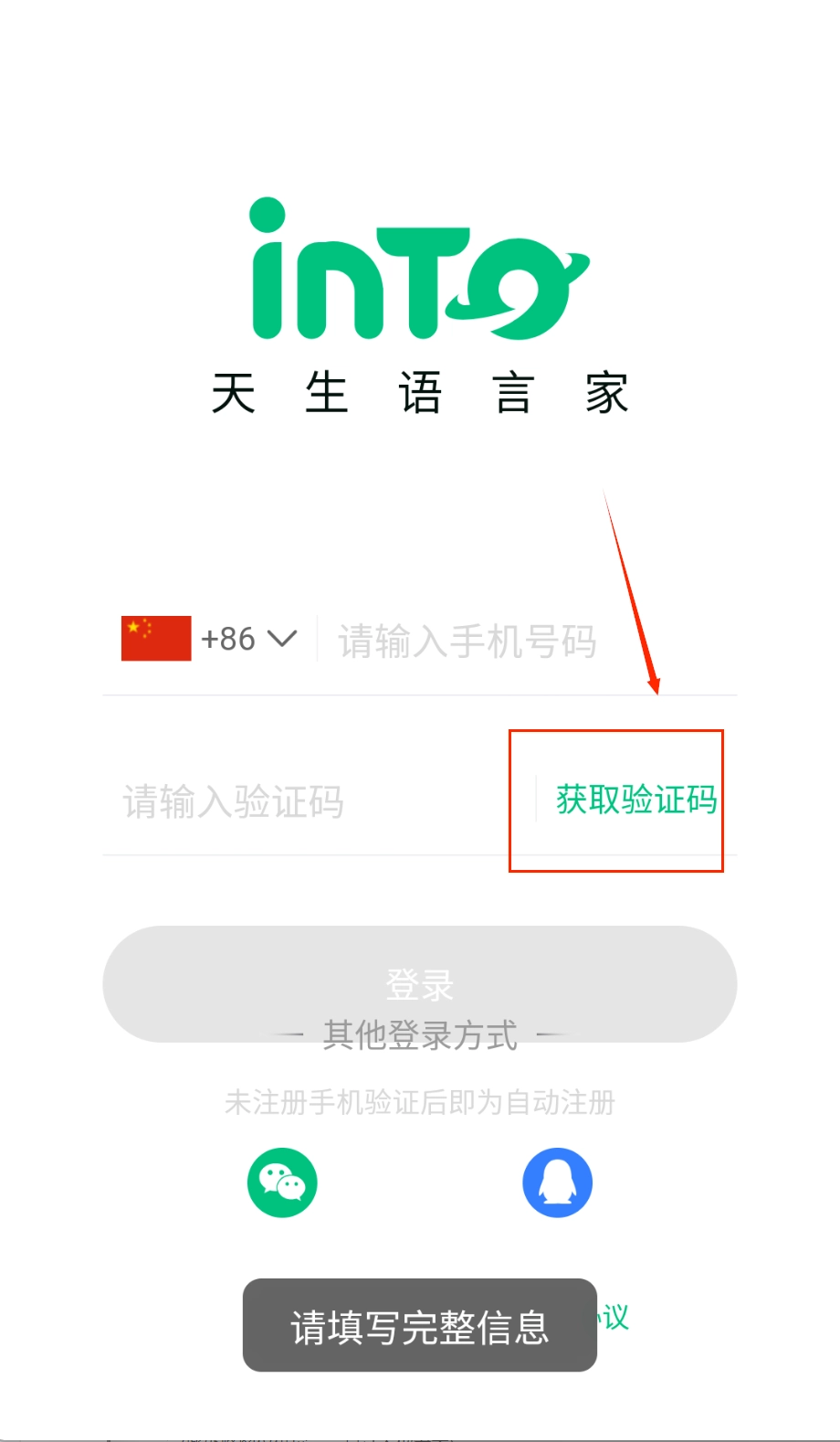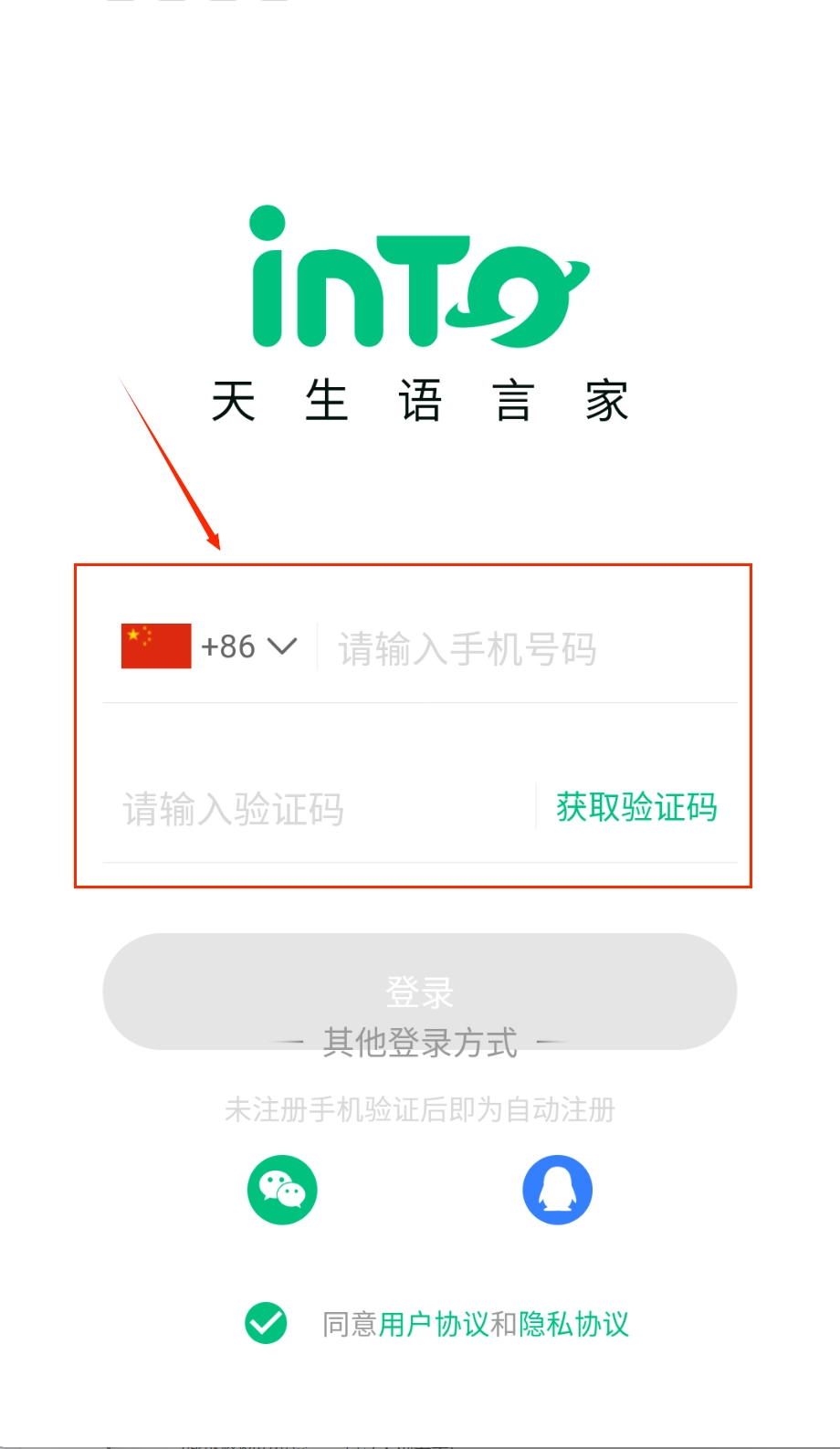 打开软件后,首先映入眼帘的是简洁的登录界面。在手机号输入框中填写您的号码即可,需要注意的是,输入框左侧默认显示的是中国+86区号。