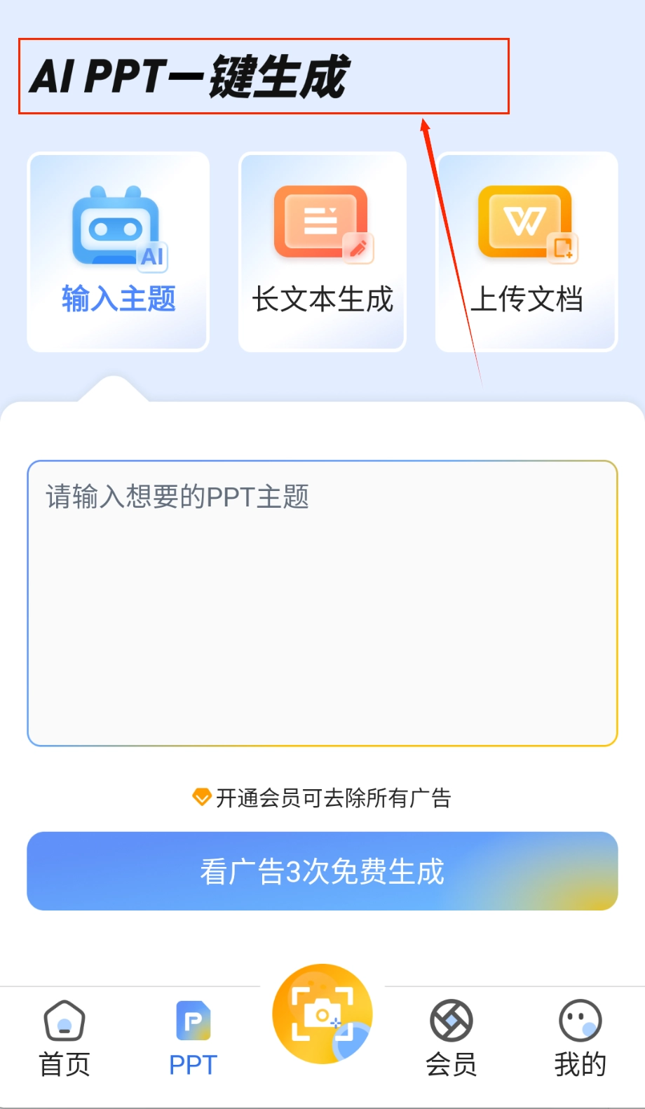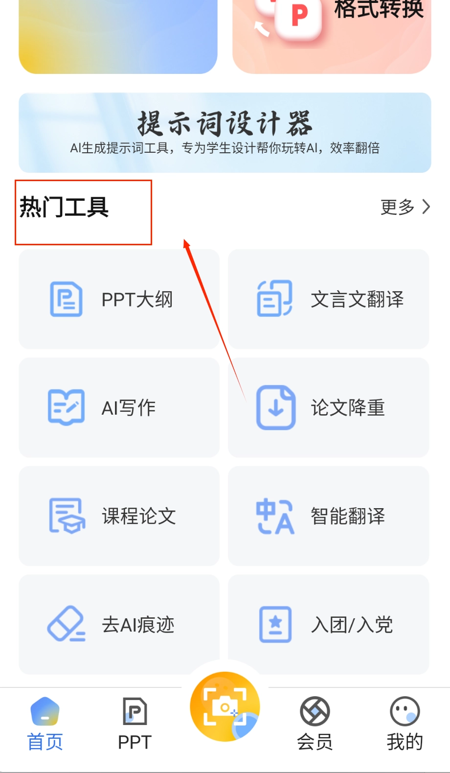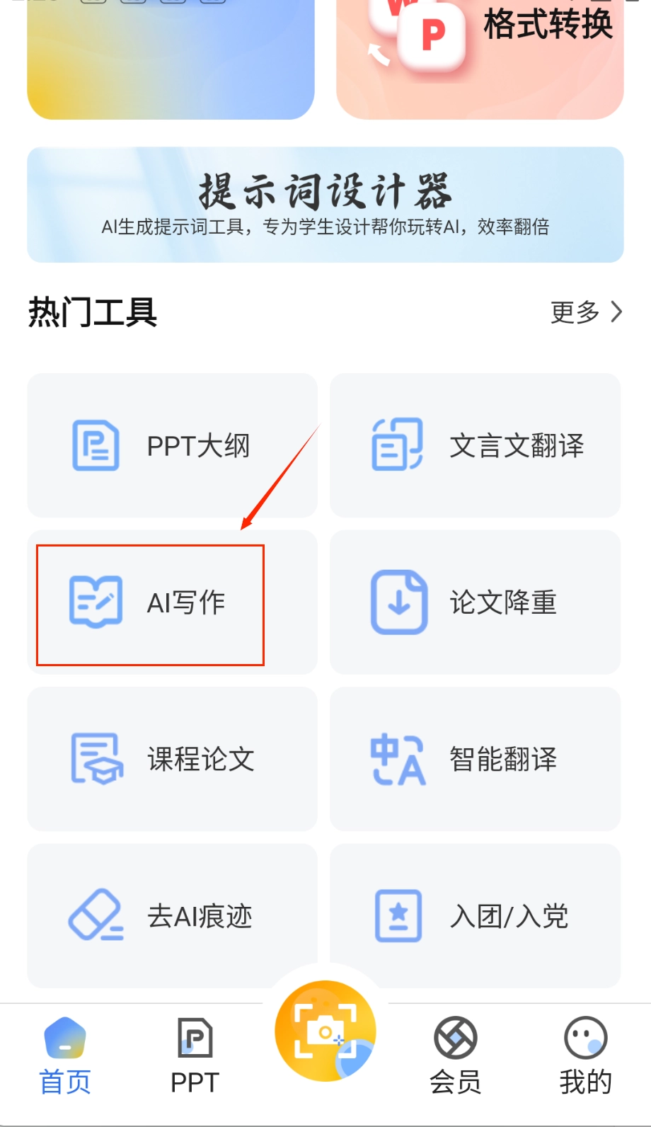 打开应用后,在主界面选择所需的功能模块,这里清晰呈现了PPT生成、文档转换、智能写作等核心功能区域,点击对应的图标就能进入具体操作页面。