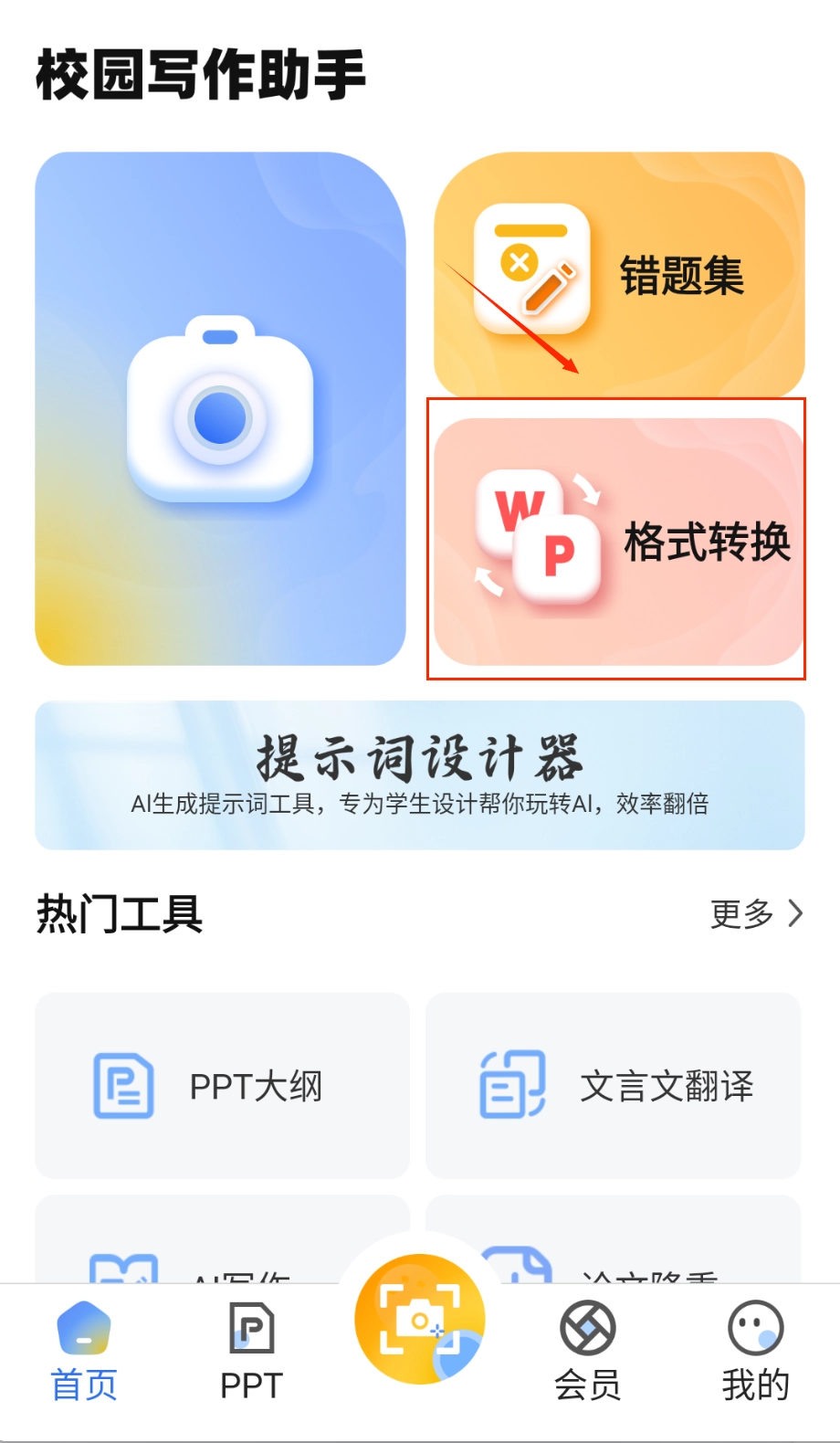 整合多种实用功能,帮助用户高效完成学习任务。通过输入关键词或上传文档可快速生成PPT,满足不同场景需求。智能写作模块能根据用户需求自动生成内容,并提供创作灵感。支持多种文档格式转换,操作简单便捷。该应用还包含提示词设计器和丰富学习工具。校园写作助手怎么用