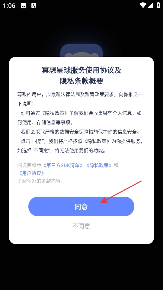 1、打开软件点击【同意】接受服务协议及隐私条款。