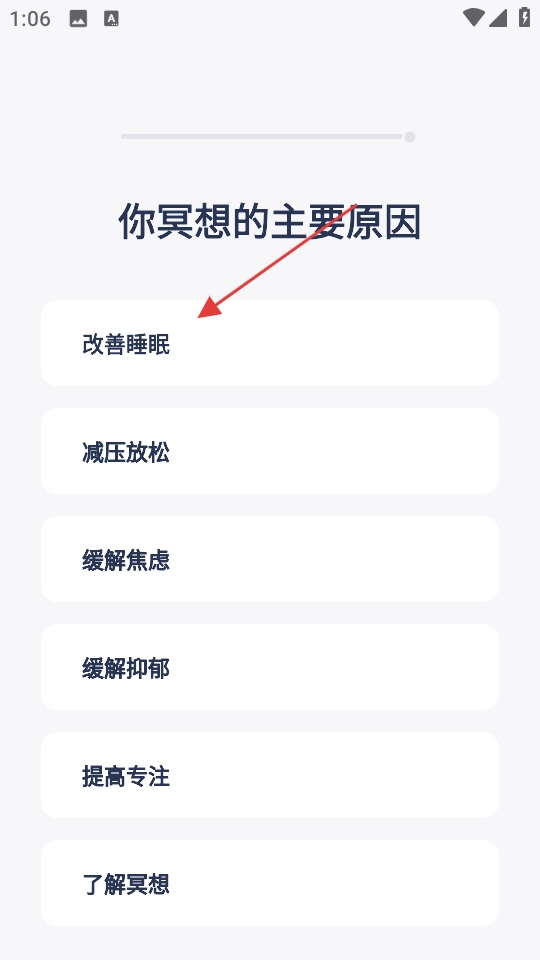 2、选择【改善睡眠】等选项表明冥想主要原因。