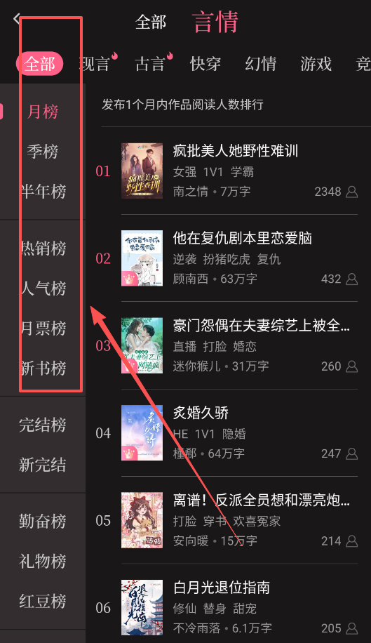 3、书城里的各类排行榜单颇具参考意义,月榜呈现近期热门作品,季榜收录长期优质好书,这些榜单可助你迅速找到精品小说。