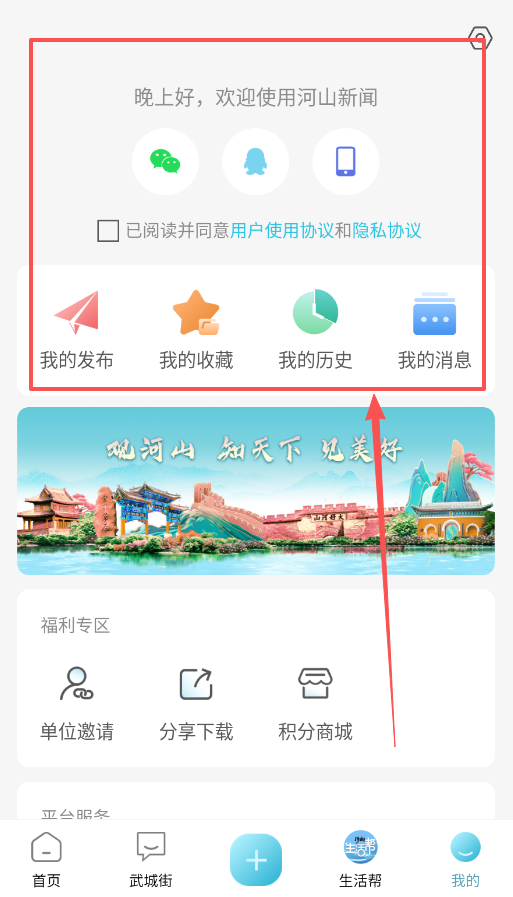 首先打开河山新闻,在首页底部的导航栏里能看到“首页”“武城街”“生活帮”“我的”这四个主要板块。