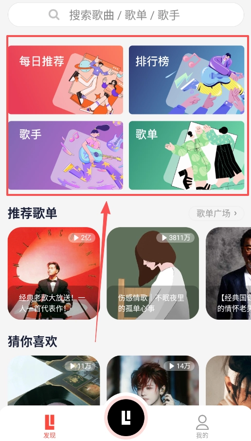 想找新歌的话,可以切换到发现页面的推荐歌单板块,这里会依据你的喜好推荐经典老歌、伤感情歌等不同风格的歌曲。