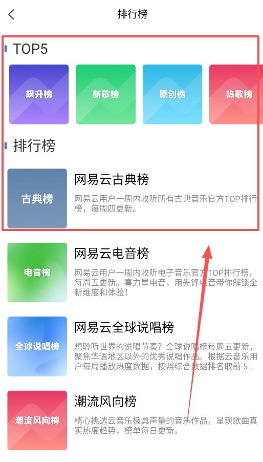 3、排行榜专区设有飙升榜、新歌榜等五大权威榜单,同时涵盖古典榜、电音榜等垂直分类,每个榜单均明确标注了更新频率。