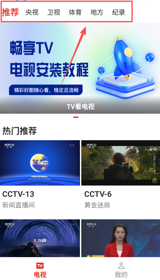 进入推荐页面后,顶部设有分类导航栏,涵盖央视、卫视、体育、地方、纪录等类别,只需滑动选择即可快速切换频道类型。