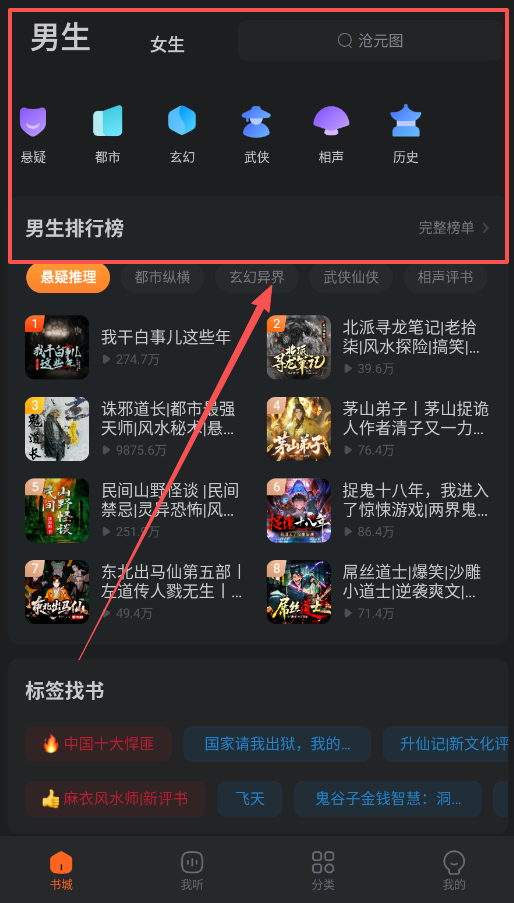 1、首先呢,打开软件后,在底部导航栏找到“书城”这一栏,这里可以看到“男生”“女生”“热门分类”等入口。