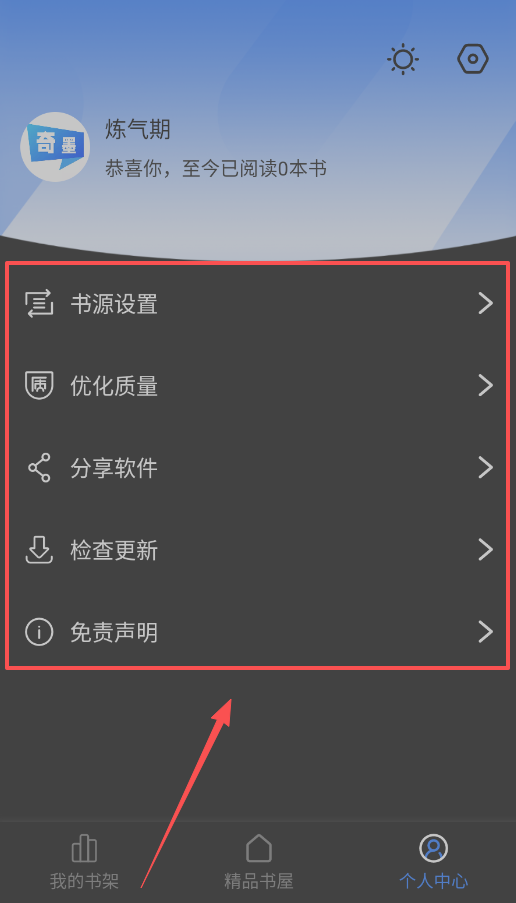 1、打开软件,先看看你的炼气期等级,挺有成就感的。然后点开书源设置,优化一下阅读质量。