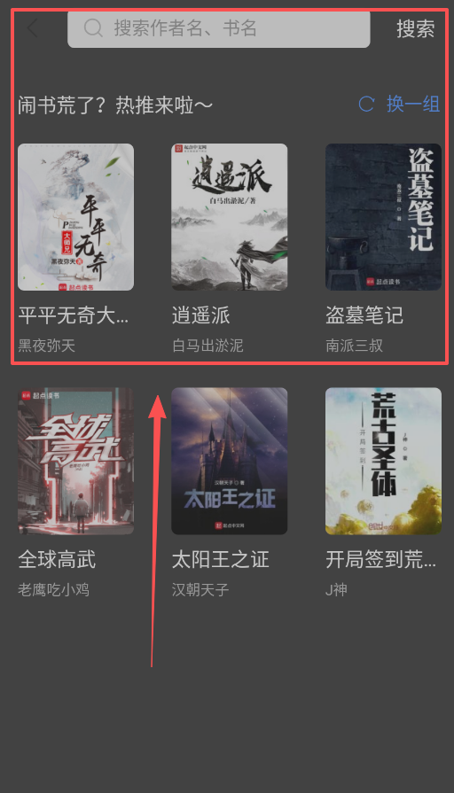 4、知道想找什么书,就用搜索功能。如果不知道,就去热推板块,那个换一组按钮按一下。