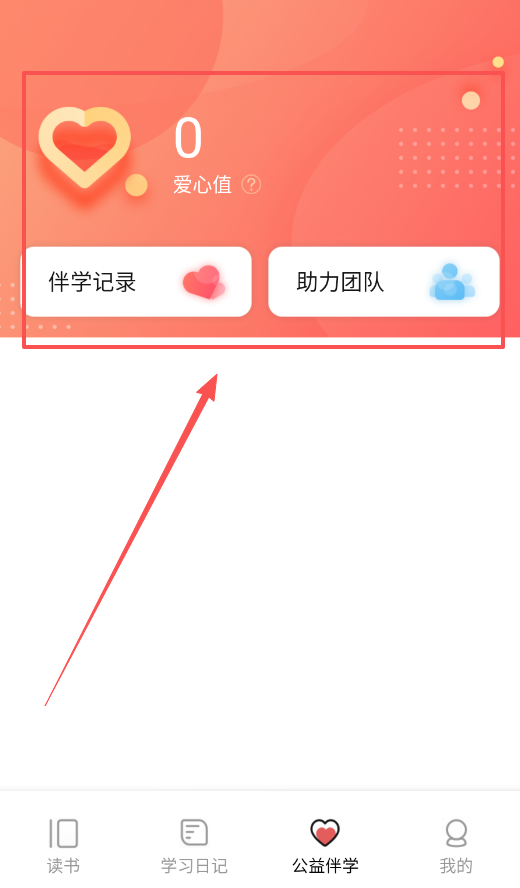 4、最后别忘了关注公益伴学板块,这里可以查看你的爱心值和伴学记录,通过完成读书,写日记等学习任务,你不仅能提升自己。