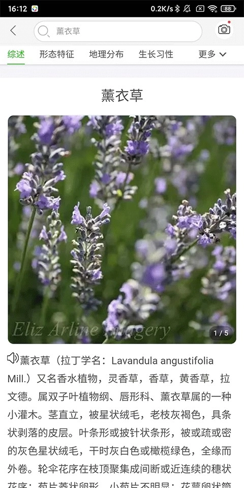 3、待系统完成物种识别后,就能查看该物种的综述、形态特征、地理分布、生长习性等详细资料了。