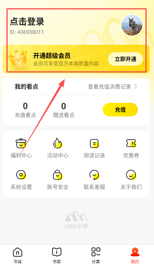 1、首先在底部导航栏选择“我的”,完成账号注册或登录,这样才能使用书架、充值等完整功能。