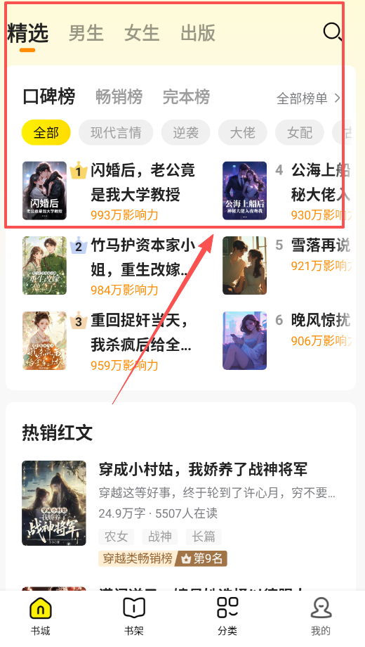 2、想快速找热门好书,就进入“书城”页,这里提供了口碑榜、畅销榜等多种榜单,直接点击就能开始阅读。