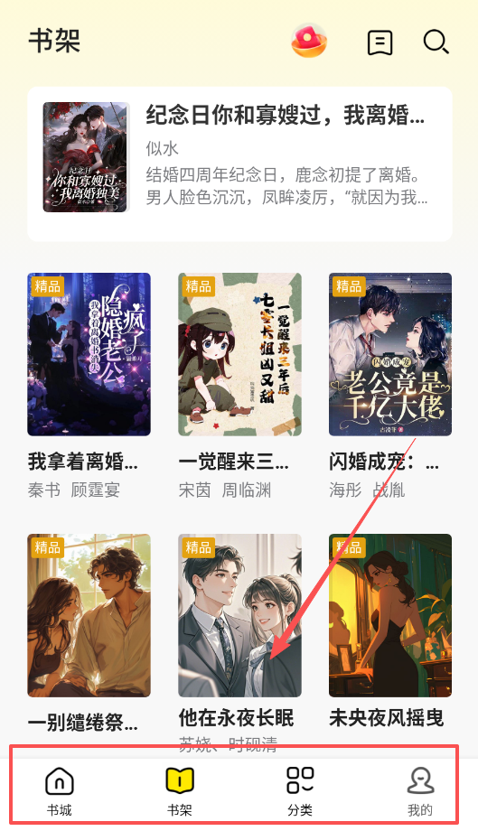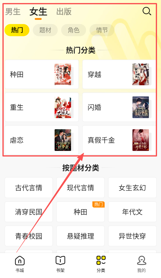 3、如果你有明确的阅读偏好,可以使用“分类”功能,按种田、穿越、重生等热门标签,或按古代言情、悬疑推理等题材来精准筛选书籍。