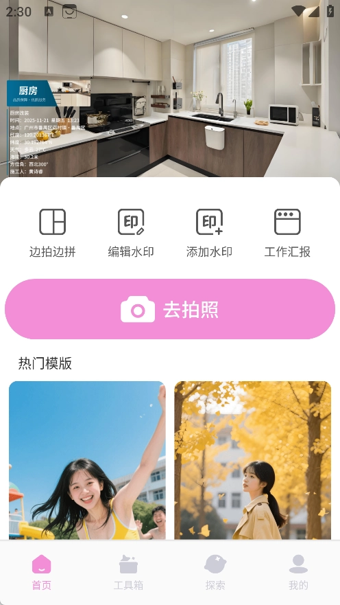 首页整合了边拍边拼、水印编辑与添加、工作汇报等实用功能,还能让用户快速了解各类热门模板。