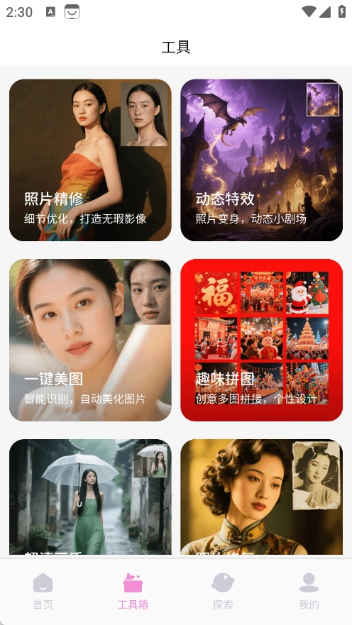 2、工具箱内配备了照片精修、动态特效、一键美图、趣味拼图、超清画质及照片修复等实用功能。