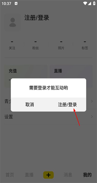 3、弹出提示框,提示需登录方可进行互动,并提供取消与注册登录两个操作选项。
