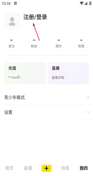 2、进入我的页面后,顶部会展示注册登录按钮,其下方设有关注、粉丝等统计类选项,接着点击该注册登录按钮。