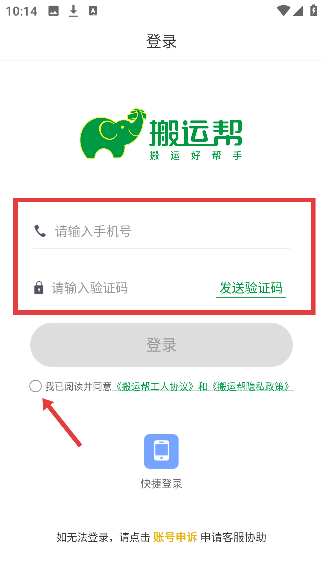 3、在登录页面输入【手机号验证码】,并勾选相关协议,完成登录前的准备操作。