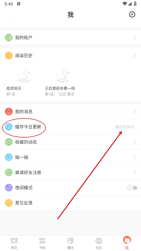 3、接着进入“我的”板块,点击“切换为今日更新”,参照图示,等待缓存完成后,就能进行离线观看了。