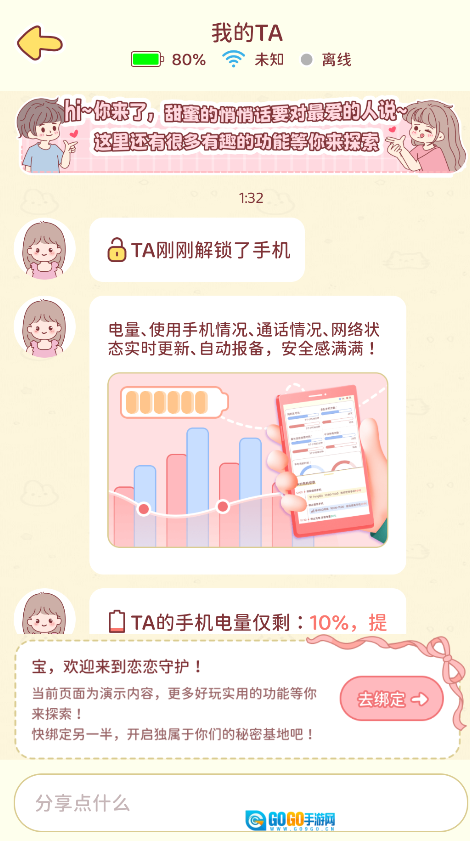 2、通过私密聊天发送实时消息,系统会智能同步对方的手机状态(如电量、位置),自动生成贴心提醒。