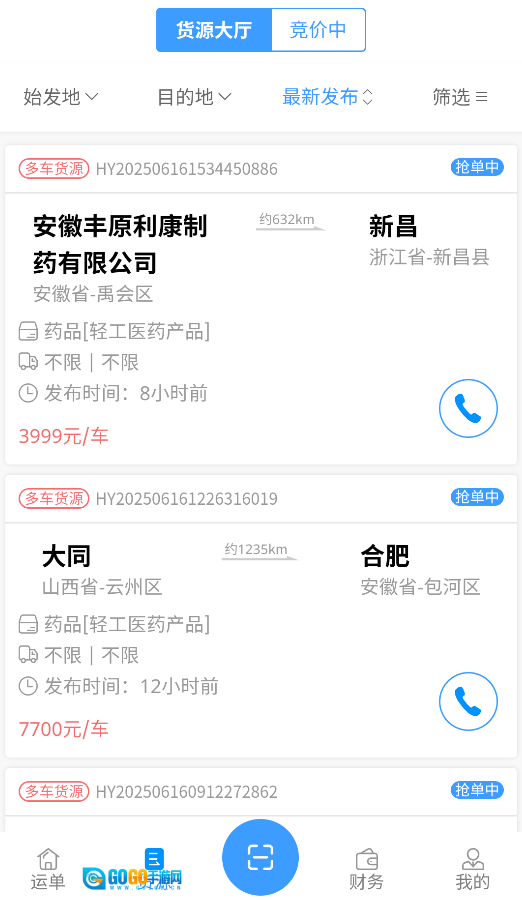 1、启动后,进入"货源大厅"浏览附近订单,点击感兴趣的单子查看运输详情。