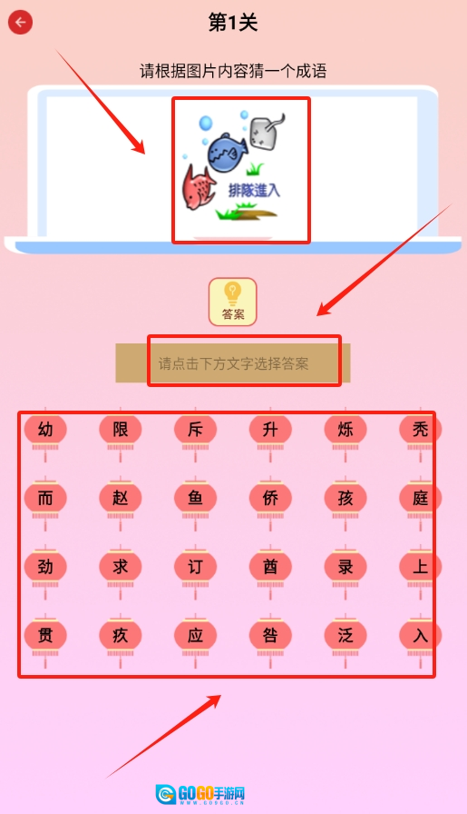 3、要是想玩的话,直接点击游戏入口就可以了。就拿看图猜成语这个游戏举例,你只需要根据给出的图片来猜测对应的成语,然后把下方的汉字按照正确顺序填到框里就完成了。