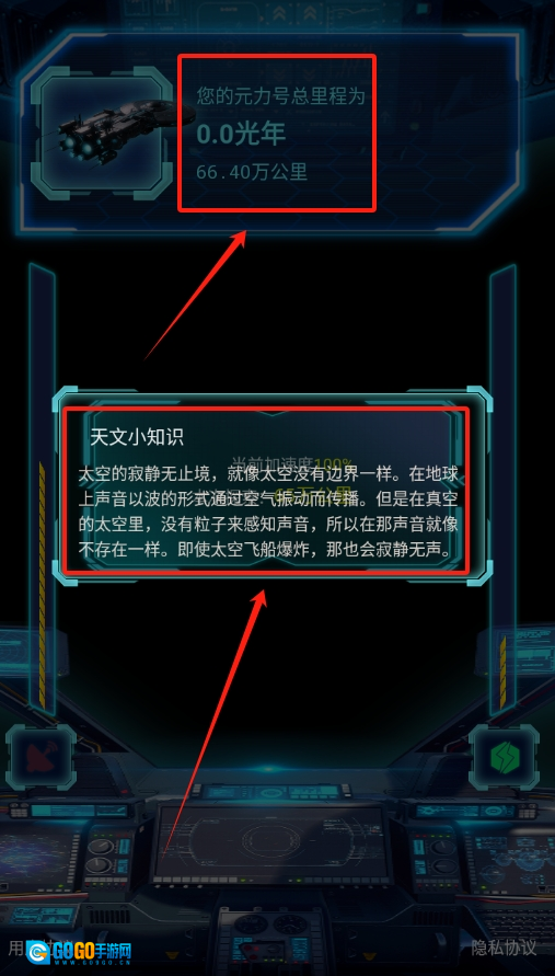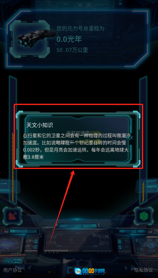 1、启动软件后,驾驶宇宙飞船踏上探索之旅,随着航行里程的持续累积,途中会随机弹出各类天文小知识。