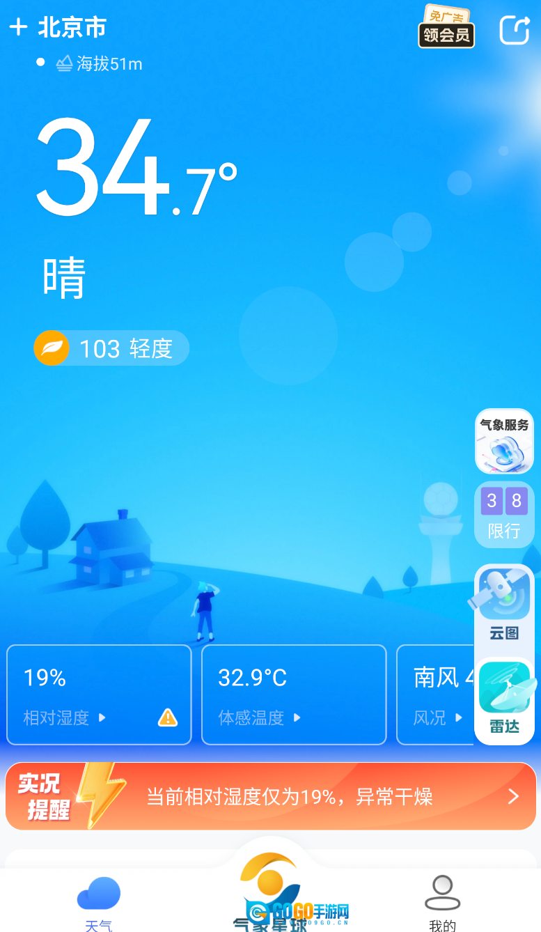2、独特的首页设计:首页界面会根据天气情况智能切换风格,雨天时高清展示气象雷达图,晴天则精美呈现云图。