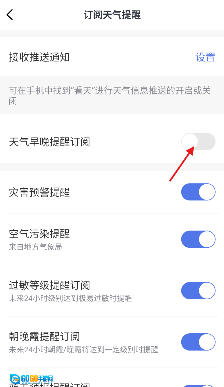 4、进入天气提醒设置页面后,找到“天气早晚提醒订阅”的选项,点击它旁边的开关按钮,就能完成订阅了。