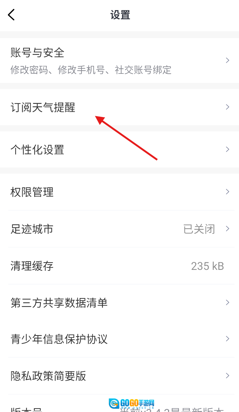 3、进入设置页面后,在众多选项中找到“订阅天气提醒”这一项,点击进入对应的设置界面。