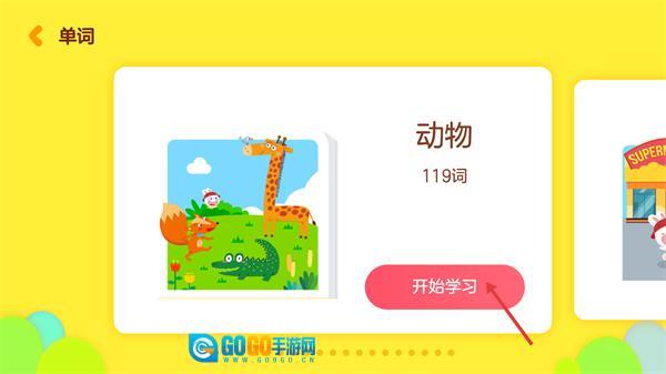 3、进入【词汇馆】对应的单词页面后,找到【动物】板块,点击该板块下方的【开始学习】按钮,就能进入对应的学习内容页面。