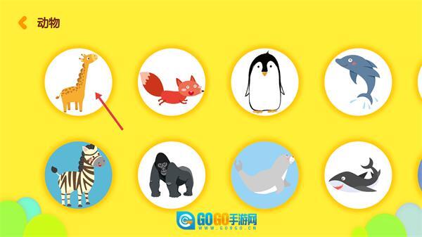 4、进入【动物】单词学习页面后,可看到长颈鹿、狐狸等动物图标,点击相应动物图标就能开启该动物对应的单词学习。