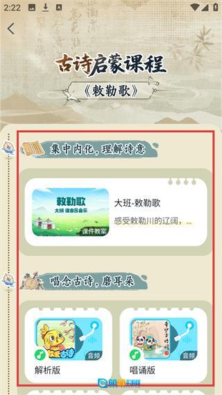 4、进入《敕勒歌》详情页后,不仅能查看【课件教案】类资源,还可获取【解析版】【唱诵版】等音频内容来辅助学习。