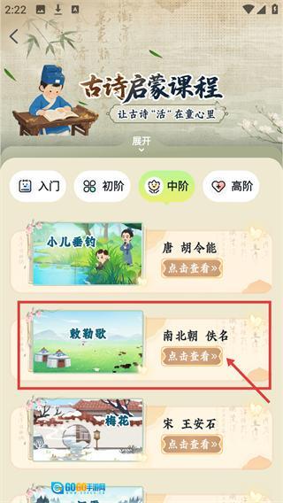 3、进入【古诗启蒙课程】的【中阶】页面后,找到《敕勒歌》并点击其对应的“点击查看”按钮,即可进入这首古诗的详情页面。