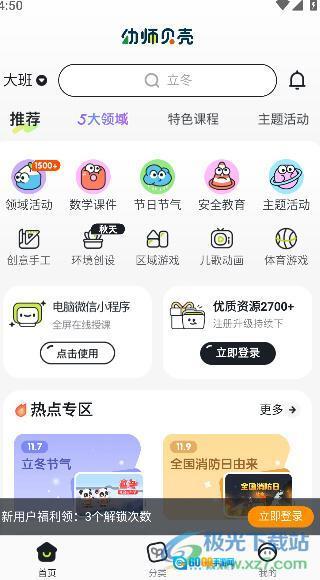 【多元课程体系】依据小、中、大各年龄段的发展特性,精心打造1000+高品质互动课件,覆盖幼儿园常见活动主题,还配备安全教育、24节气、幼小衔接等特色课程体系,实时追踪热点动态,不断更新内容资源,助力教师满足五大领域教学需求。